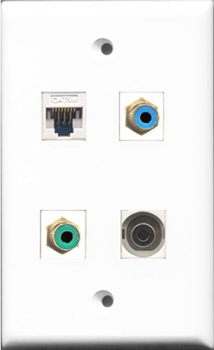 RiteAV 1 Port RCA Green and 1 Port RCA Blue and 1 Port 3.5mm and 1 Port Cat5e Ethernet White Wall Plate
