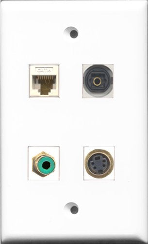 RiteAV 1 Port RCA Green and 1 Port S-Video and 1 Port Toslink and 1 Port Cat6 Ethernet White Wall Plate
