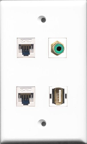 RiteAV 1 Port RCA Green and 1 Port USB A-A 2 Port Cat5e Ethernet White Wall Plate