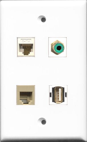 RiteAV 1 Port RCA Green and 1 Port USB A-A and 1 Port Phone RJ11 RJ12 Beige and 1 Port Cat6 Ethernet White Wall Plate