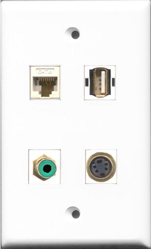 RiteAV - and 1 Port RCA Green and 1 Port USB A-A F/F and 1 Port S-Video and 1 Port Cat6 Ethernet White Wall Plate