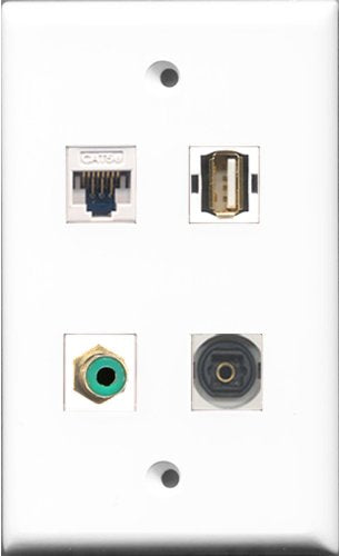 RiteAV 1 Port RCA Green and 1 Port USB A-A and 1 Port Toslink and 1 Port Cat5e Ethernet White Wall Plate