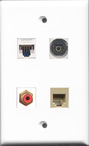 RiteAV - and 1 Port RCA Red and 1 Port Phone RJ11 RJ12 Beige and 1 Port Toslink Digital Audio and 1 Port Cat5e Ethernet White Wall Plate