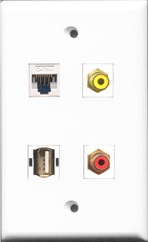 RiteAV 1 Port RCA Red and 1 Port RCA Yellow and 1 Port USB A-A and 1 Port Cat5e Ethernet White Wall Plate