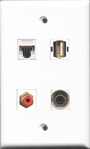 RiteAV 1 Port RCA Red and 1 Port USB A-A and 1 Port 3.5mm and 1 Port Cat5e Ethernet White Wall Plate