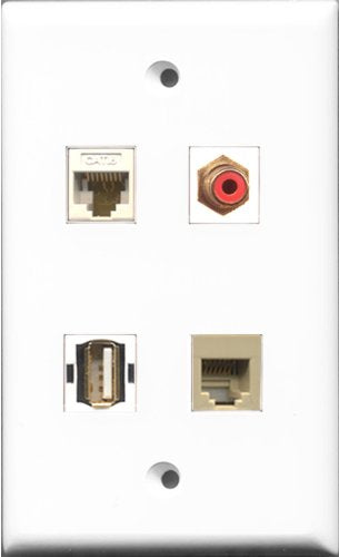 RiteAV 1 Port RCA Red and 1 Port USB A-A and 1 Port Phone RJ11 RJ12 Beige and 1 Port Cat6 Ethernet White Wall Plate
