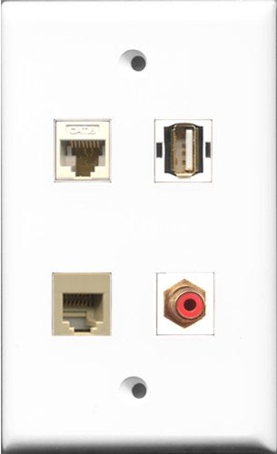 RiteAV 1 Port RCA Red and 1 Port USB A-A and 1 Port Phone RJ11 RJ12 Beige and 1 Port Cat6 Ethernet White Wall Plate
