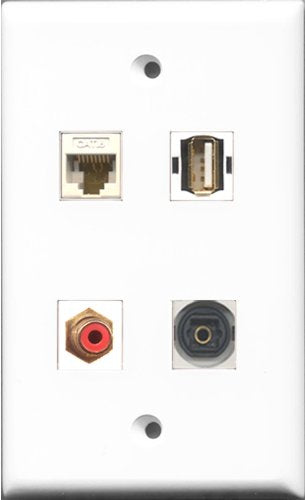 RiteAV 1 Port RCA Red and 1 Port USB A-A and 1 Port Toslink and 1 Port Cat6 Ethernet White Wall Plate