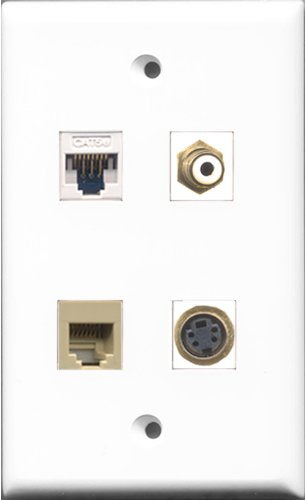 RiteAV 1 Port RCA White and 1 Port Phone RJ11 RJ12 Beige and 1 Port S-Video and 1 Port Cat5e Ethernet White Wall Plate