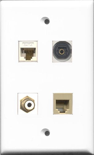 RiteAV 1 Port RCA White and 1 Port Phone RJ11 RJ12 Beige and 1 Port Toslink and 1 Port Cat6 Ethernet White Wall Plate