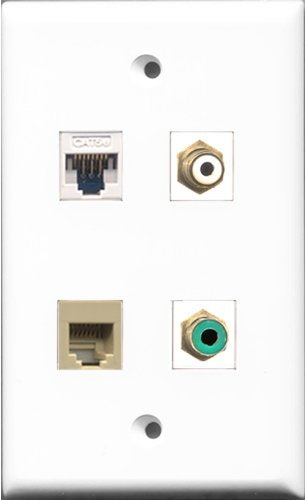 RiteAV 1 Port RCA White and 1 Port RCA Green and 1 Port Phone RJ11 RJ12 Beige and 1 Port Cat5e Ethernet White Wall Plate
