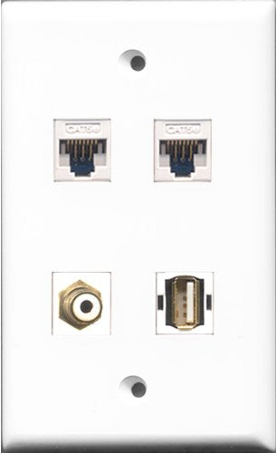 RiteAV - 1 Port RCA White and 1 Port USB A-A 2 Port Cat5e Ethernet White Wall Plate