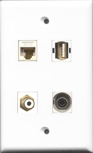 RiteAV 1 Port RCA White and 1 Port USB A-A and 1 Port 3.5mm and 1 Port Cat6 Ethernet White Wall Plate