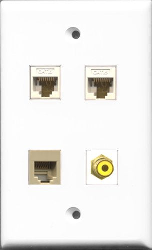 RiteAV 1 Port RCA Yellow and 1 Port Phone RJ11 RJ12 Beige 2 Port Cat6 Ethernet White Wall Plate