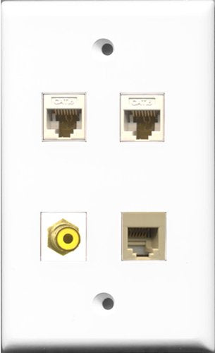 RiteAV 1 Port RCA Yellow and 1 Port Phone RJ11 RJ12 Beige 2 Port Cat6 Ethernet White Wall Plate