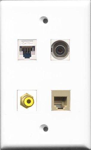 RiteAV - 1 Port RCA Yellow and 1 Port Phone RJ11 RJ12 Beige and 1 Port 3.5mm and 1 Port Cat5e Ethernet White Wall Plate