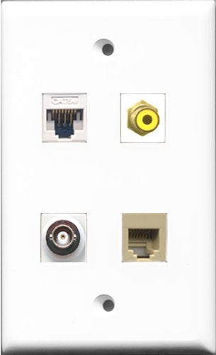 RiteAV 1 Port RCA Yellow and 1 Port Phone RJ11 RJ12 Beige and 1 Port BNC and 1 Port Cat5e Ethernet White Wall Plate