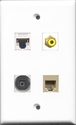 RiteAV - and 1 Port RCA Yellow and 1 Port Phone RJ11 RJ12 Beige and 1 Port Toslink Digital Audio and 1 Port Cat5e Ethernet White Wall Plate