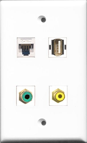 RiteAV 1 Port RCA Yellow and 1 Port RCA Green and 1 Port USB A-A and 1 Port Cat5e Ethernet White Wall Plate