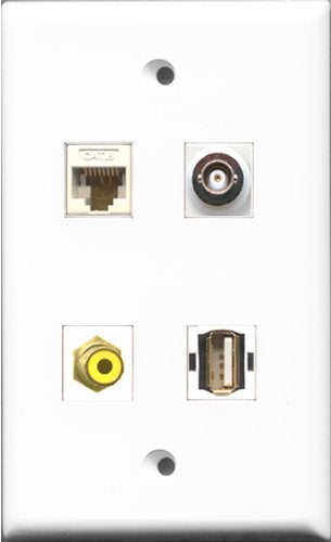 RiteAV 1 Port RCA Yellow and 1 Port USB A-A and 1 Port BNC and 1 Port Cat6 Ethernet White Wall Plate