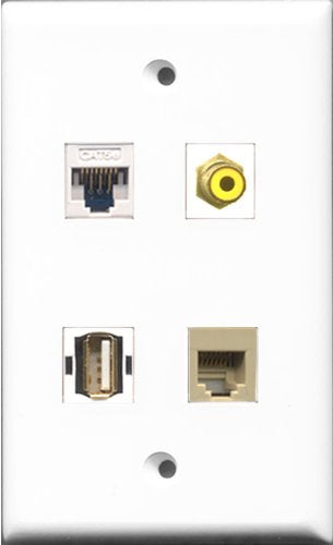 RiteAV 1 Port RCA Yellow and 1 Port USB A-A and 1 Port Phone RJ11 RJ12 Beige and 1 Port Cat5e Ethernet White Wall Plate
