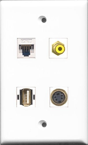 RiteAV 1 Port RCA Yellow and 1 Port USB A-A and 1 Port S-Video and 1 Port Cat5e Ethernet White Wall Plate