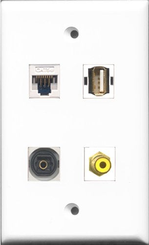 RiteAV 1 Port RCA Yellow and 1 Port USB A-A and 1 Port Toslink and 1 Port Cat5e Ethernet White Wall Plate