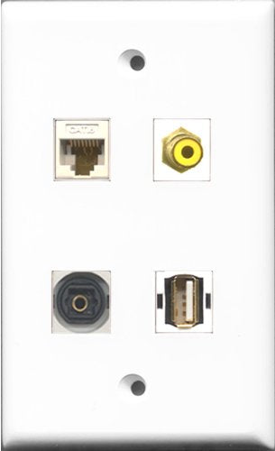 RiteAV 1 Port RCA Yellow and 1 Port USB A-A and 1 Port Toslink and 1 Port Cat6 Ethernet White Wall Plate