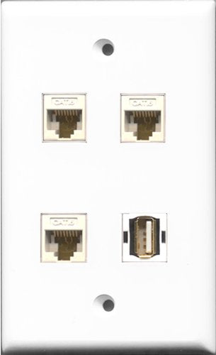 RiteAV 1 Port USB A-A 3 Port Cat6 Ethernet White Wall Plate