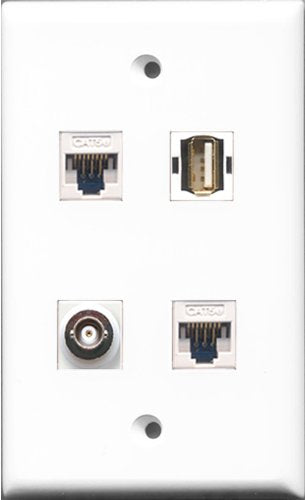 RiteAV 1 Port USB A-A and 1 Port BNC 2 Port Cat5e Ethernet White Wall Plate