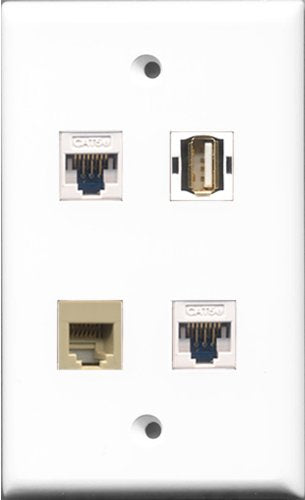 RiteAV 1 Port USB A-A and 1 Port Phone RJ11 RJ12 Beige 2 Port Cat5e Ethernet White Wall Plate