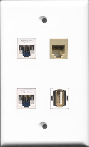 RiteAV 1 Port USB A-A and 1 Port Phone RJ11 RJ12 Beige 2 Port Cat5e Ethernet White Wall Plate