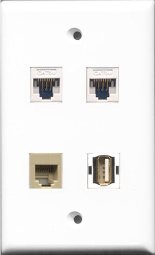 RiteAV - 1 Port USB A-A and 1 Port Phone RJ11 RJ12 Beige 2 Port Cat5e Ethernet White Wall Plate