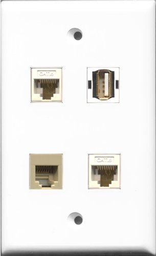 RiteAV 1 Port USB A-A and 1 Port Phone RJ11 RJ12 Beige 2 Port Cat6 Ethernet White Wall Plate