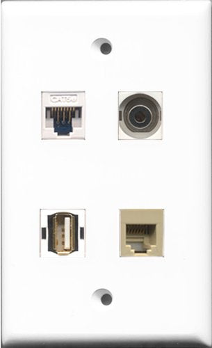 RiteAV - 1 Port USB A-A and 1 Port Phone RJ11 RJ12 Beige and 1 Port 3.5mm and 1 Port Cat5e Ethernet White Wall Plate