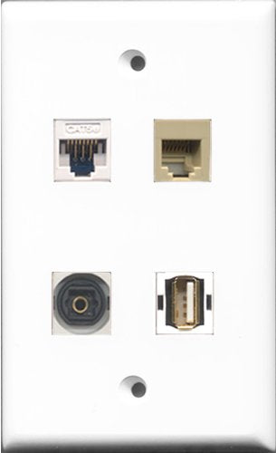 RiteAV 1 Port USB A-A and 1 Port Phone RJ11 RJ12 Beige and 1 Port Toslink and 1 Port Cat5e Ethernet White Wall Plate