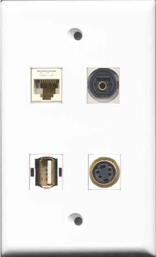 RiteAV 1 Port USB A-A and 1 Port S-Video and 1 Port Toslink and 1 Port Cat6 Ethernet White Wall Plate
