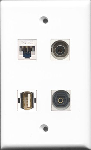 RiteAV - 1 Port USB A-A and 1 Port Toslink and 1 Port 3.5mm and 1 Port Cat5e Ethernet White Wall Plate