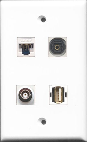 RiteAV 1 Port USB A-A and 1 Port Toslink and 1 Port BNC and 1 Port Cat5e Ethernet White Wall Plate