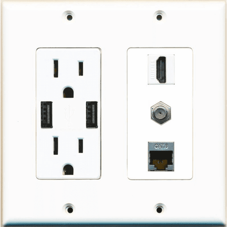 RiteAV 15 Amp 125V Power Outlet (2 USB Charger Receptacle) Hdmi Coax Shielded Cat6 Wall Plate White