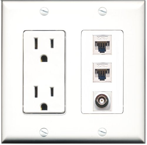 RiteAV - 15 Amp Power Outlet 1 Port BNC 2 Port Cat5e Ethernet White Decorative Wall Plate