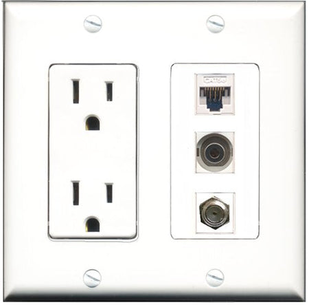 RiteAV - 15 Amp Power Outlet 1 Port Coax 1 Port 3.5mm 1 Port Cat5e Ethernet White Decorative Wall Plate