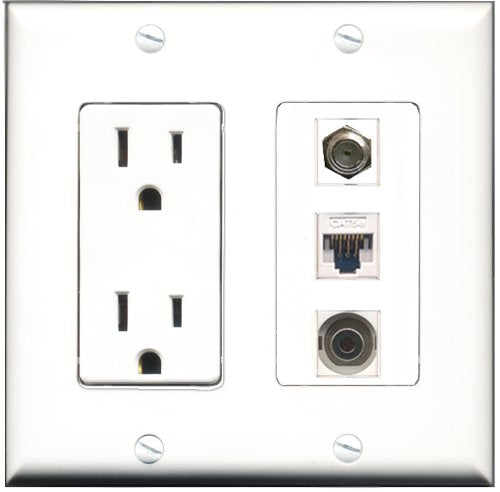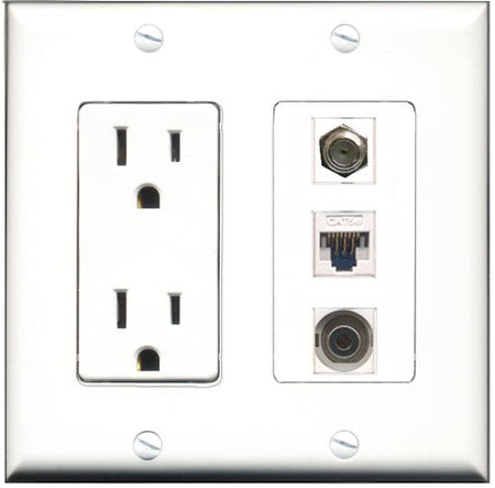 RiteAV - 15 Amp Power Outlet 1 Port Coax 1 Port 3.5mm 1 Port Cat5e Ethernet White Decorative Wall Plate
