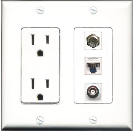 RiteAV - 15 Amp Power Outlet 1 Port Coax 1 Port BNC 1 Port Cat5e Ethernet White Decorative Wall Plate
