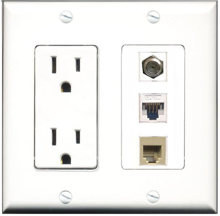 RiteAV - 15 Amp Power Outlet 1 Port Coax 1 Port Phone Beige 1 Port Cat5e Ethernet White Decorative Wall Plate