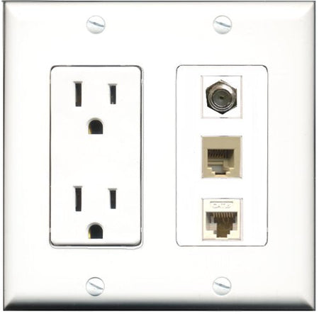 RiteAV - 15 Amp Power Outlet 1 Port Coax 1 Port Phone Beige 1 Port Cat6 Ethernet Ethernet White Decorative Wall Plate
