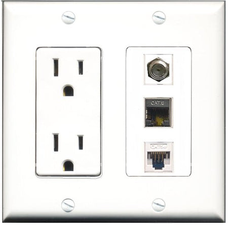 RiteAV - 15 Amp Power Outlet 1 Port Coax 1 Port Shielded Cat6 Ethernet Ethernet 1 Port Cat5e Ethernet White Decorative Wall Plate