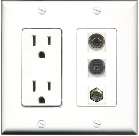 Please note: It is required to install this item in a divided outlet box. Recommended compatible outlet boxes Carlon BH234R (Old work). This is a 2 Piece Decorative Wall Plate (plate and plate cover). Tooless connection, Just plug one cable into the front and one into the back. Outlet needs to be hard wired as a regular outlet. High quality, screws included. Fits standard outlet boxes, decora(tive) plates and mounting brackets. Female on both sides of the plate jacks for easy plugin. 4 inch distance between screws. This is not a GFCI outlet and is not to be installed near or behind a kitchen sink, bathtub, bathroom or within 12-15 feet of any source of water. Must be installed into a new or existing plastic or metal outlet electrical box for safety. Do not install this with a drywall only mounting bracket.