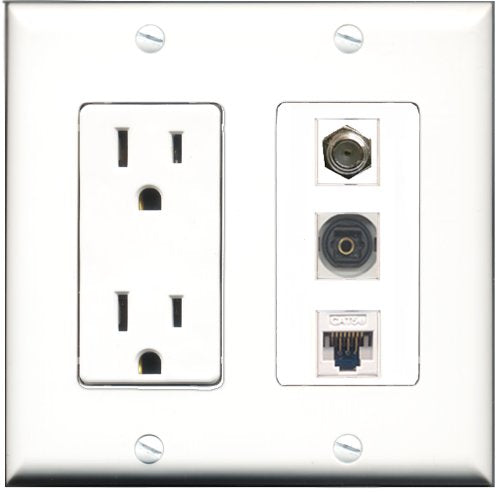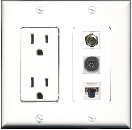 RiteAV - 15 Amp Power Outlet 1 Port Coax 1 Port Toslink 1 Port Cat5e Ethernet White Decorative Wall Plate