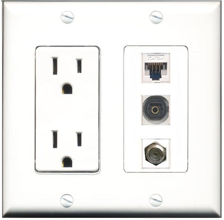 RiteAV - 15 Amp Power Outlet 1 Port Coax 1 Port Toslink 1 Port Cat5e Ethernet White Decorative Wall Plate